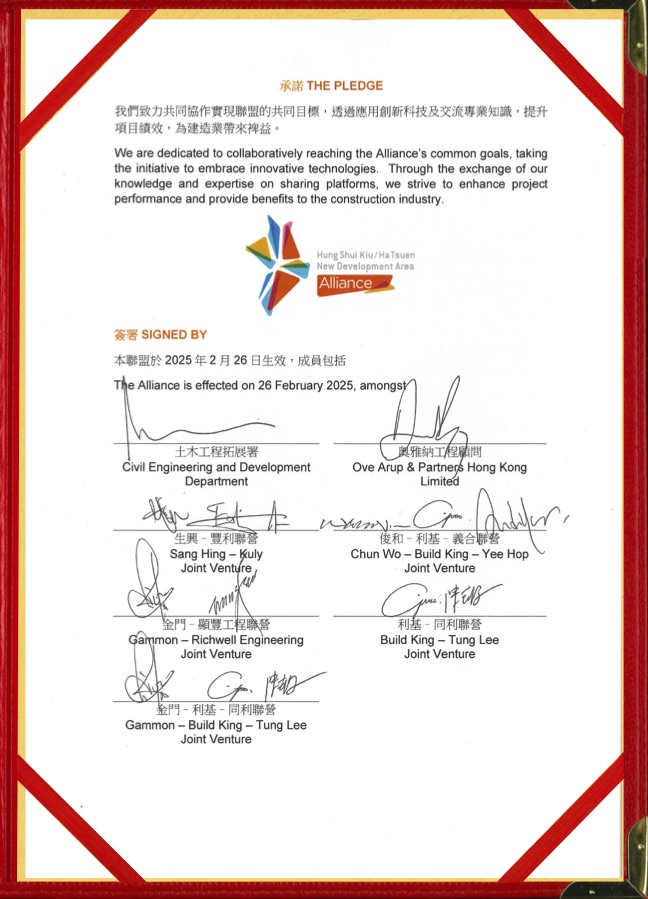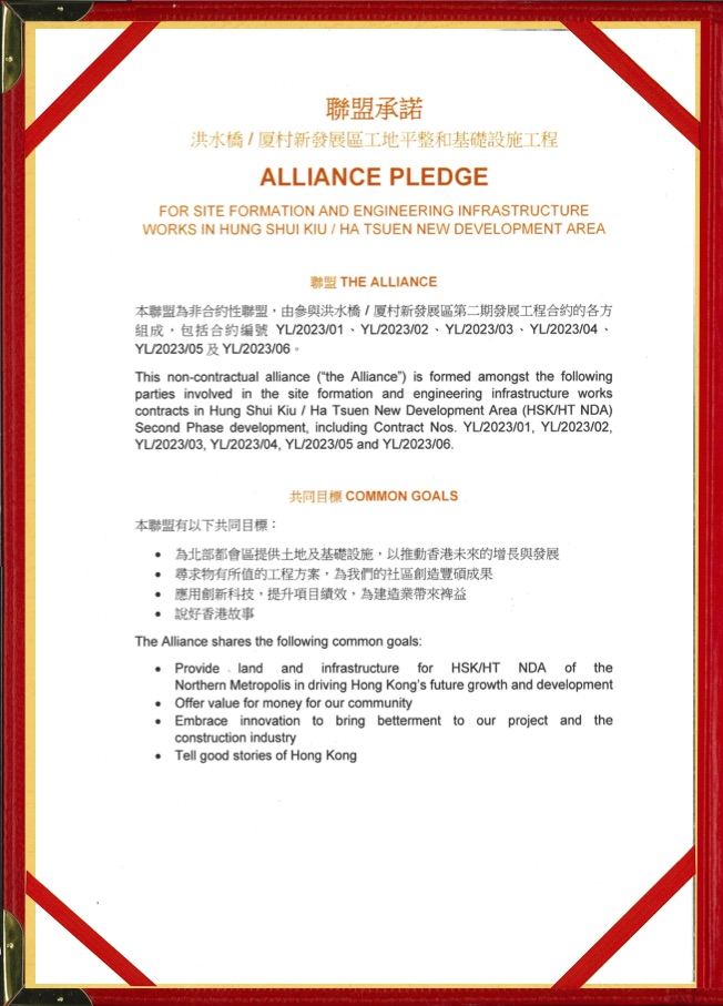 洪水桥/厦村新发展区率先引入创新合作模式,于第二期发展中与工程顾问及承建商组成联盟,携手推动项目发展。透过创新平台促进各方协作,致力实现共同目标,为区内未来发展奠定稳固基础,亦为北部都会区其他新发展区提供宝贵参考。